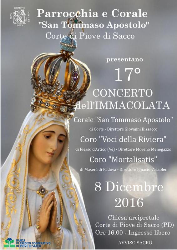 La Corale "San Tommaso Apostolo" e la Parrocchia di Corte sono liete di invitarvi alla 20.a edizione del "Concerto dell'Immacolata" che si terrà domenica 8 dicembre 2019 alle ore 16.00 presso la Chiesa arcipretale di Corte. Oltre alla nostra Corale parrocchiale vi sarà la partecipazione della "Choralis Nova" di Legnaro diretta dal maestro Angelo Rizzante, dal Coro "Madonna Annunciata" di Arzergrande diretto dal maestro Raffaele Biasin.